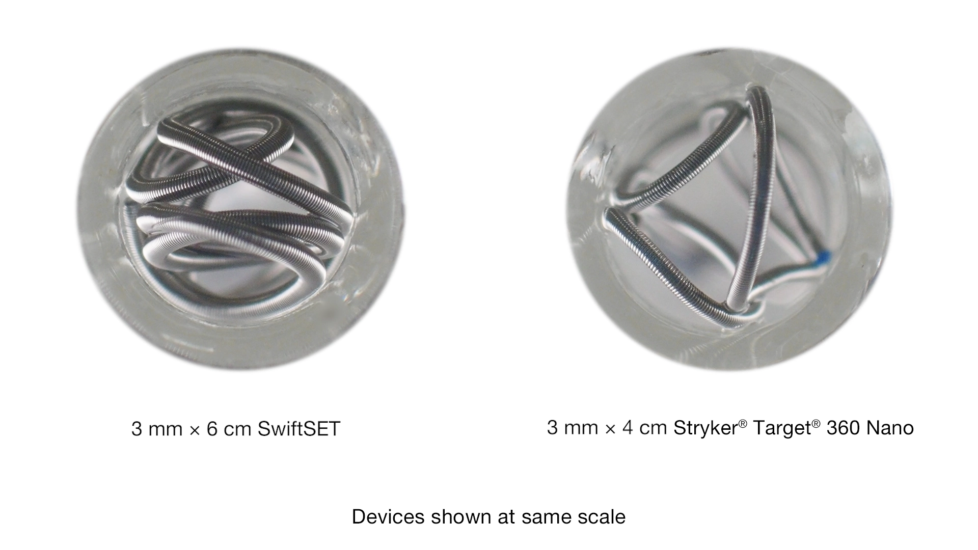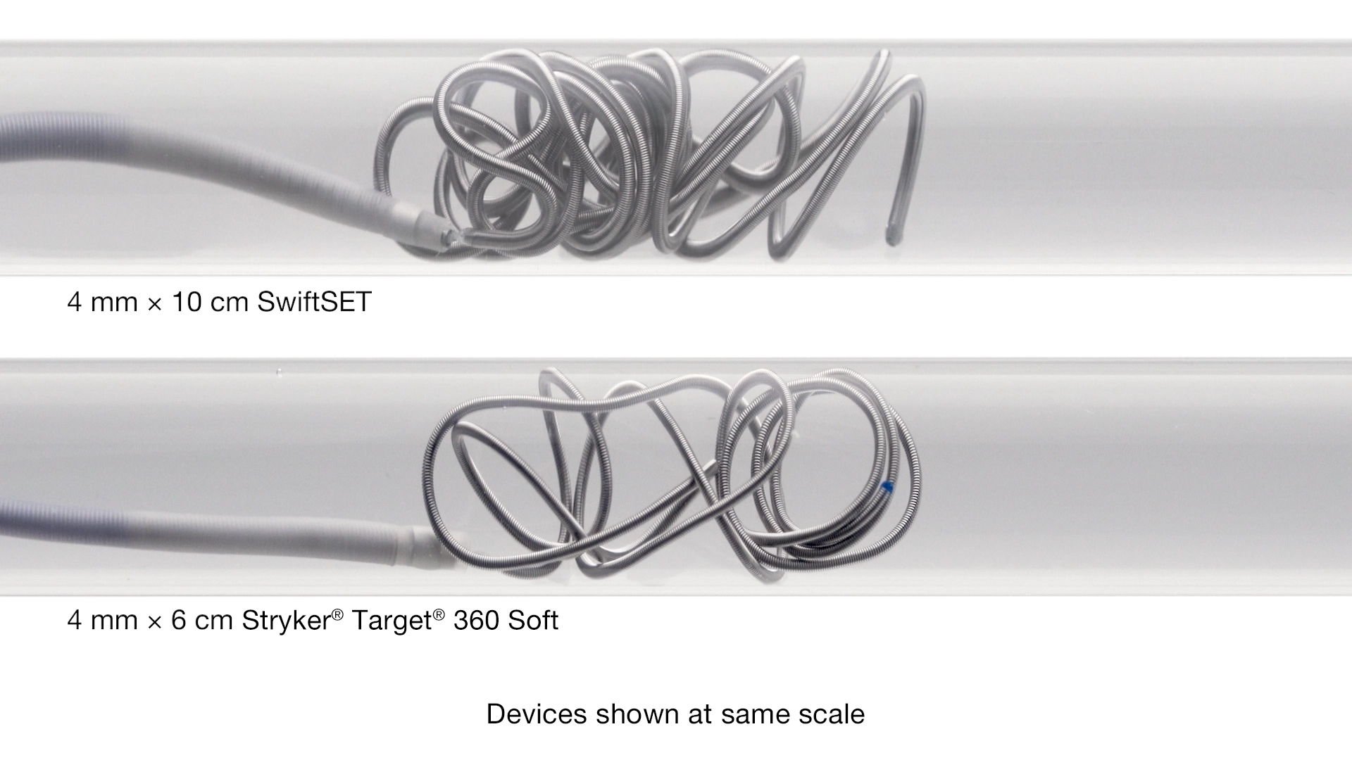 • The SwiftSET Coil is a .0135″ primary diameter coil. SwiftSET is designed to optimize vessel wall apposition through its shape configuration, and is designed to facilitate smooth deployment and natural conformity to tight spaces for dense occlusion in small vessels.